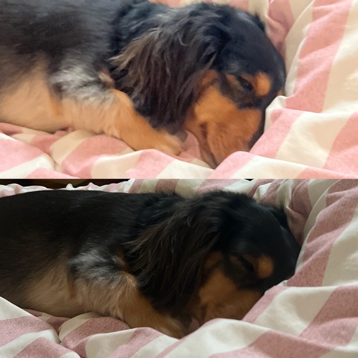 こんにちは✨ パパ様の近くで、一緒にお昼寝💤 可愛いですね🩷安心して寝ているお顔 ですね🐶
